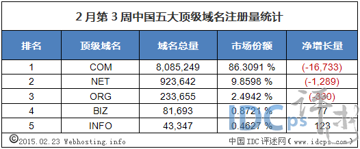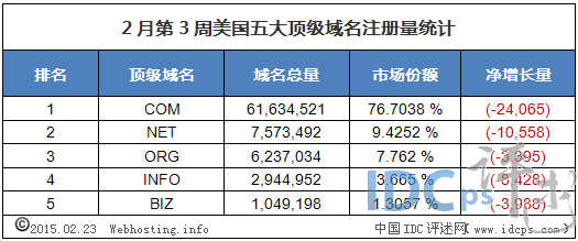 (圖1)2月第3周中美五大頂級(jí)域名注冊量統(tǒng)計(jì)(截至2015-02-23)