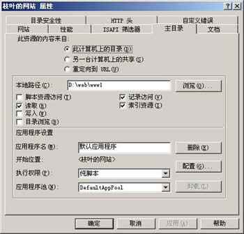 網站訪問權限是限定用戶訪問網站時的權限,“讀取”是必需的,“運行腳本”可以讓站點支持ASP,其它權限可根據需要設置。