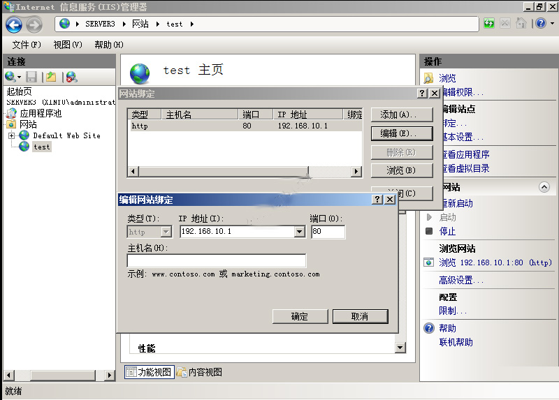 如果你想修改網(wǎng)站的綁定的IP地址或者域名,你可以選中站點(diǎn),然后右健,有一個(gè)編輯綁定,可以在這里修改。