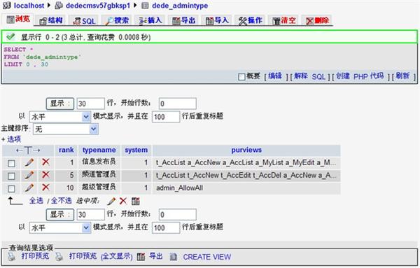 2、其中rank字段是管理權限,在phpmyadmin查看dede_admintype字段的時候采用”瀏覽模式“可以看到下面的截圖: