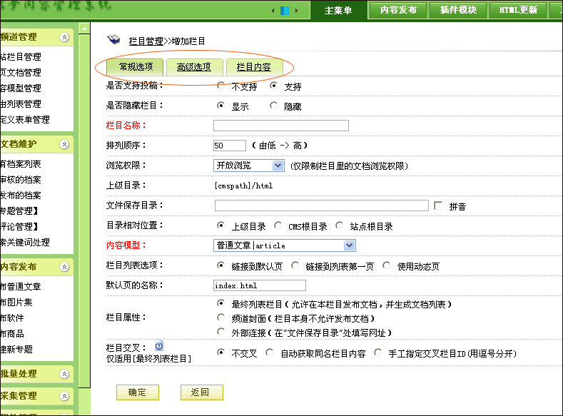 2、欄目屬性:決定當前欄目是普通的多頁列表還是單個封面頁或跳轉到其它網址的鏈接;
