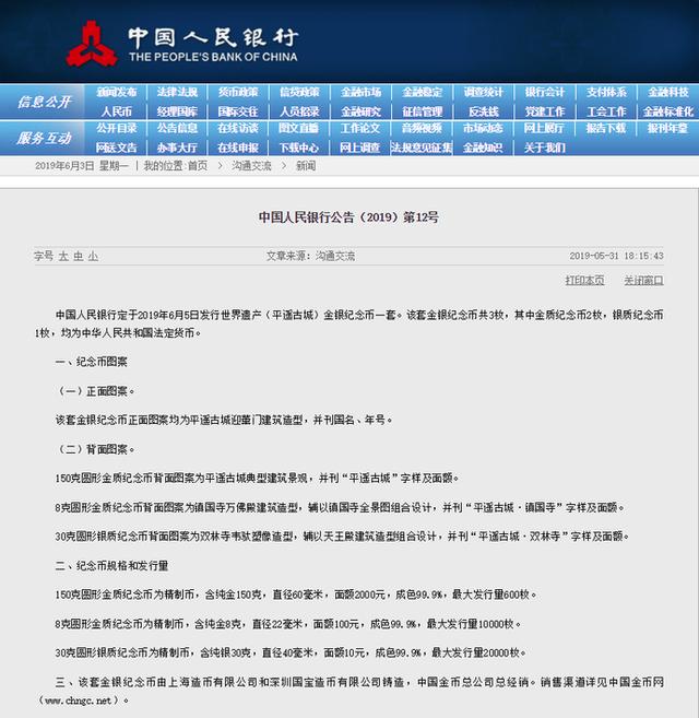 中國人民銀行定于2019年6月5日發(fā)行世界遺產(平遙古城)金銀紀念幣一套。該套金銀紀念幣共3枚,其中金質紀念幣2枚,銀質紀念幣1枚,均為中華人民共和國法定貨幣。